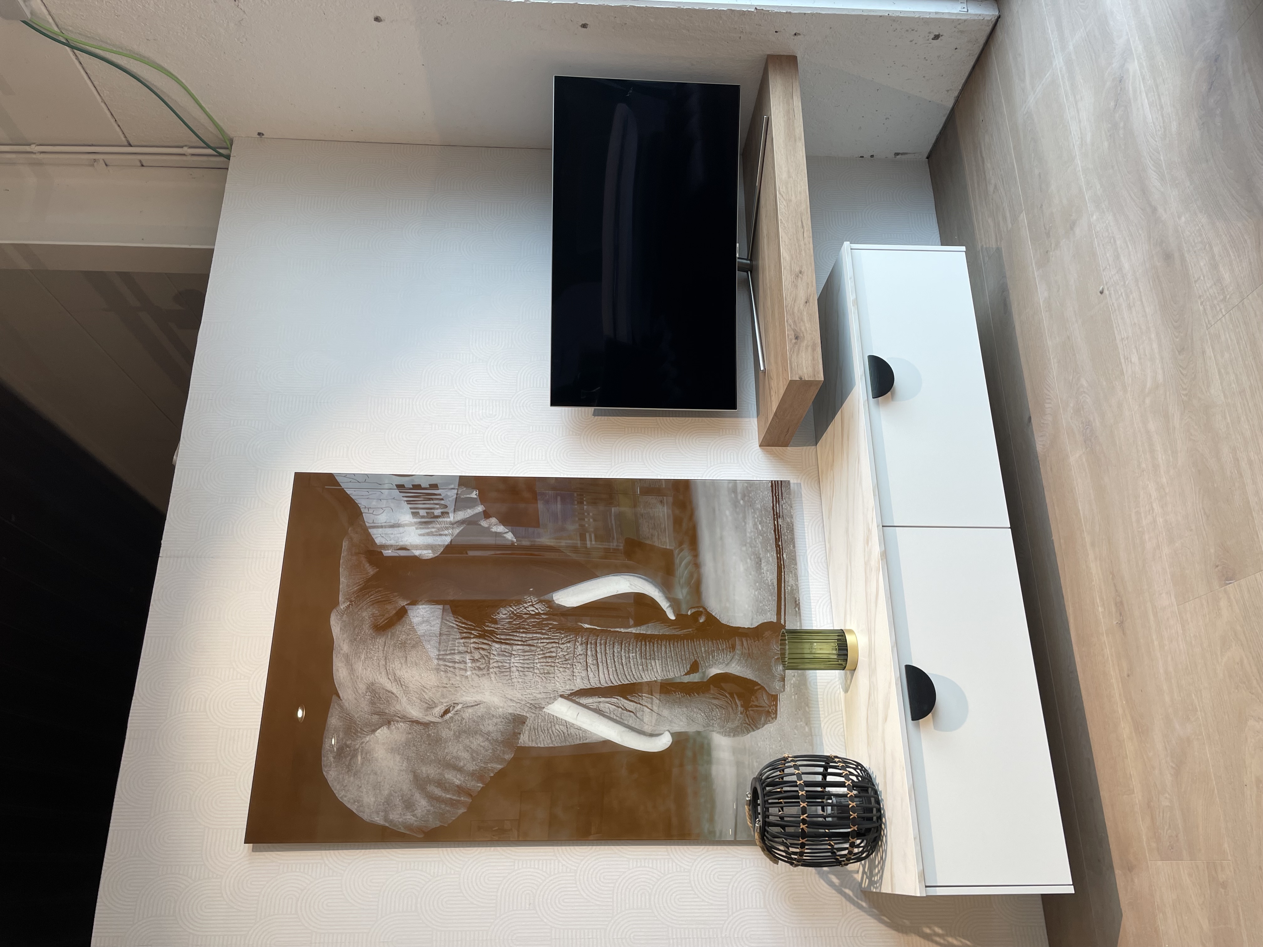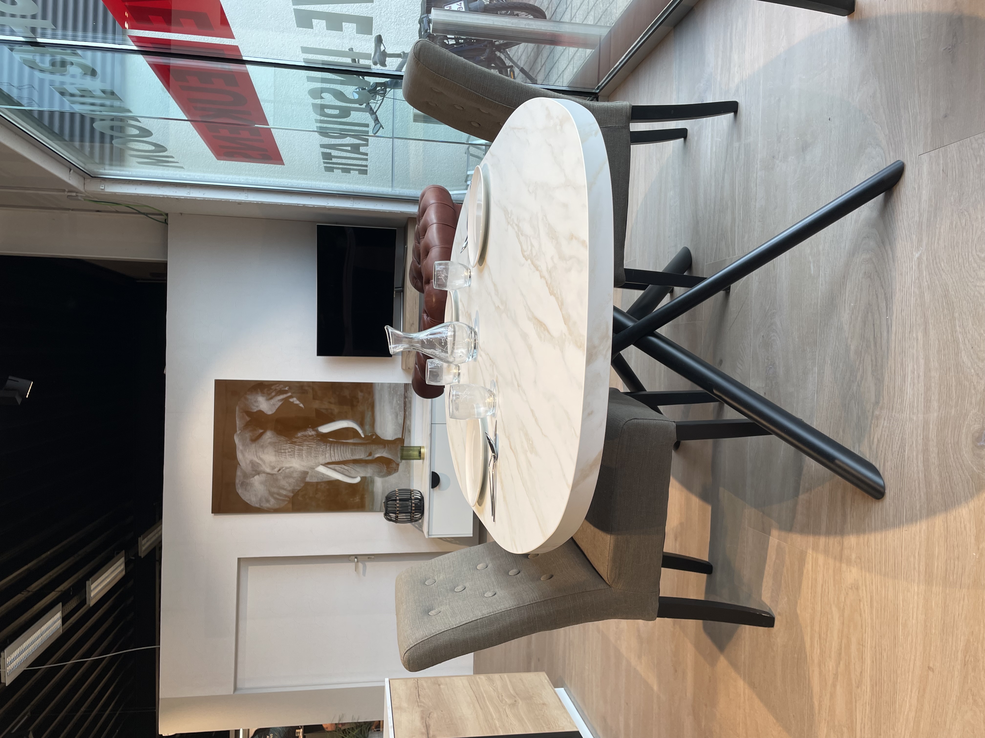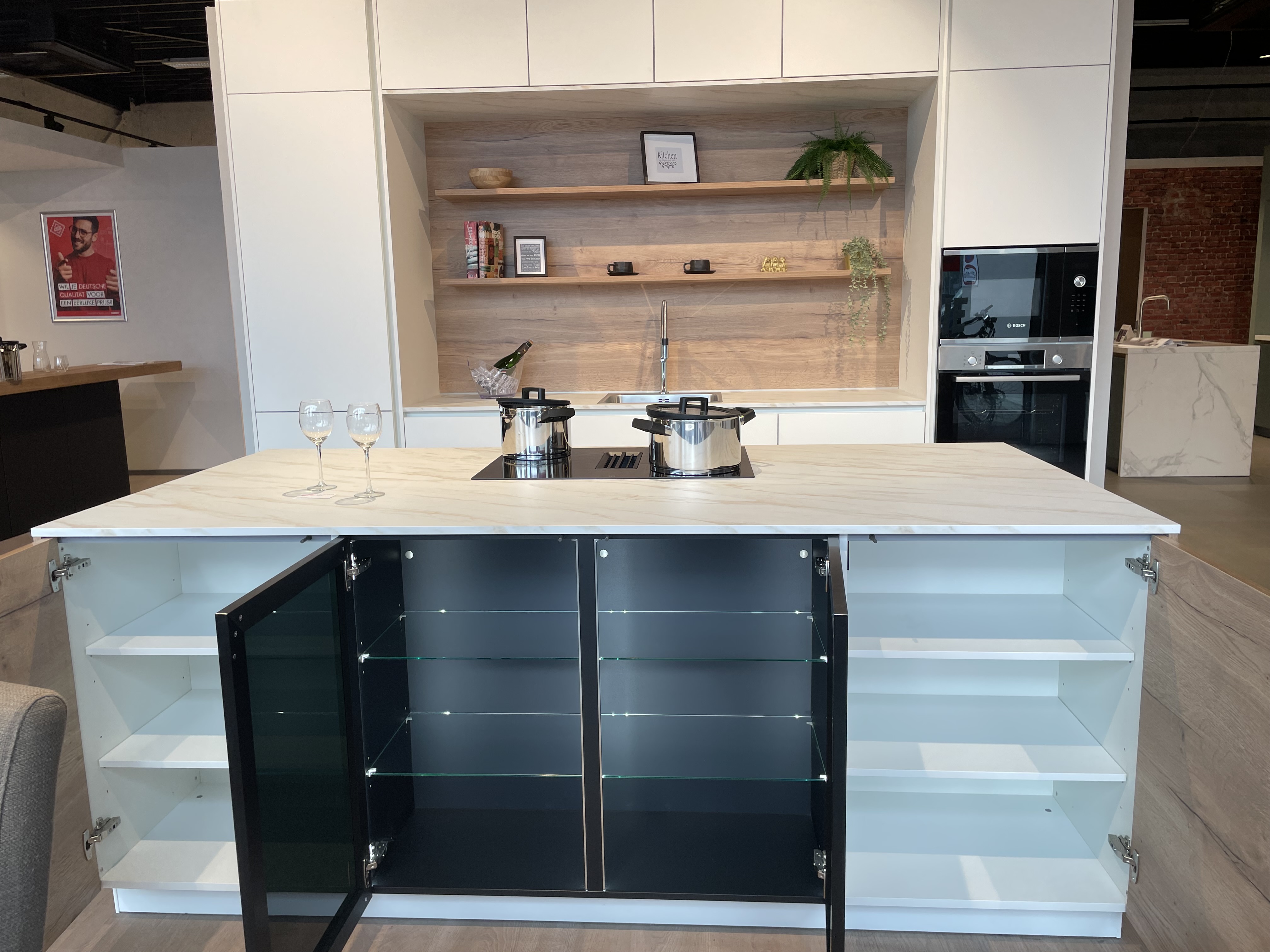 Hoge kasten met opzetkasten, hoge kolom voor koelkast 190cm, kolom voor Oven en magnetron, greeploos, nis vaatwasser, ruime eiland met kookplaat en inbouw dampkap, 2x vitrine xl-onderkasten met verlichting, spoelladekast. wand planken, achterwand in decor. Mechanische openingsondersteuning bi de lade. Slim Line werkblad Decor Carrara Brons, Tafel in bootvorm met X onderstel. Living wandkasten met klep & Konsol