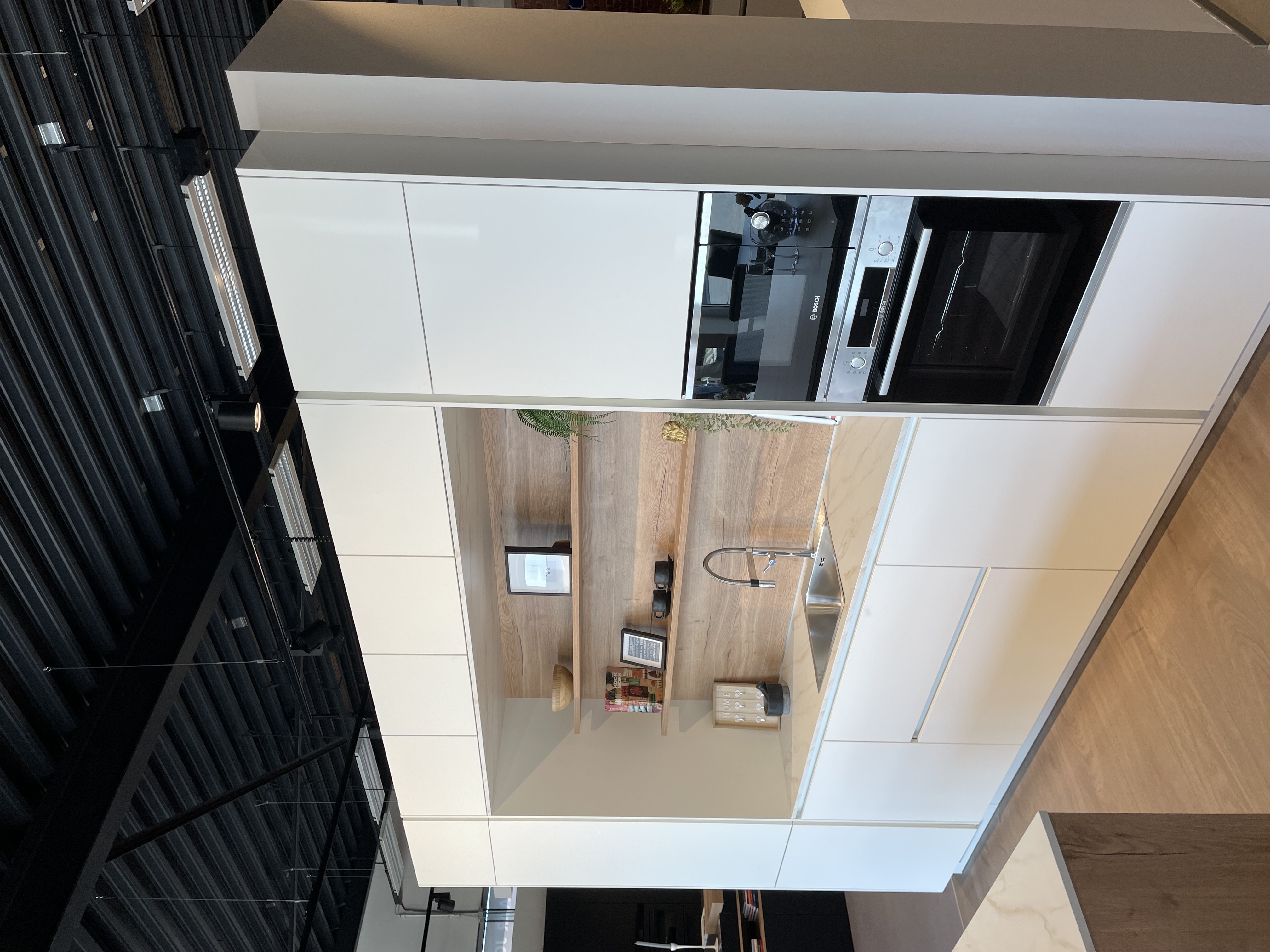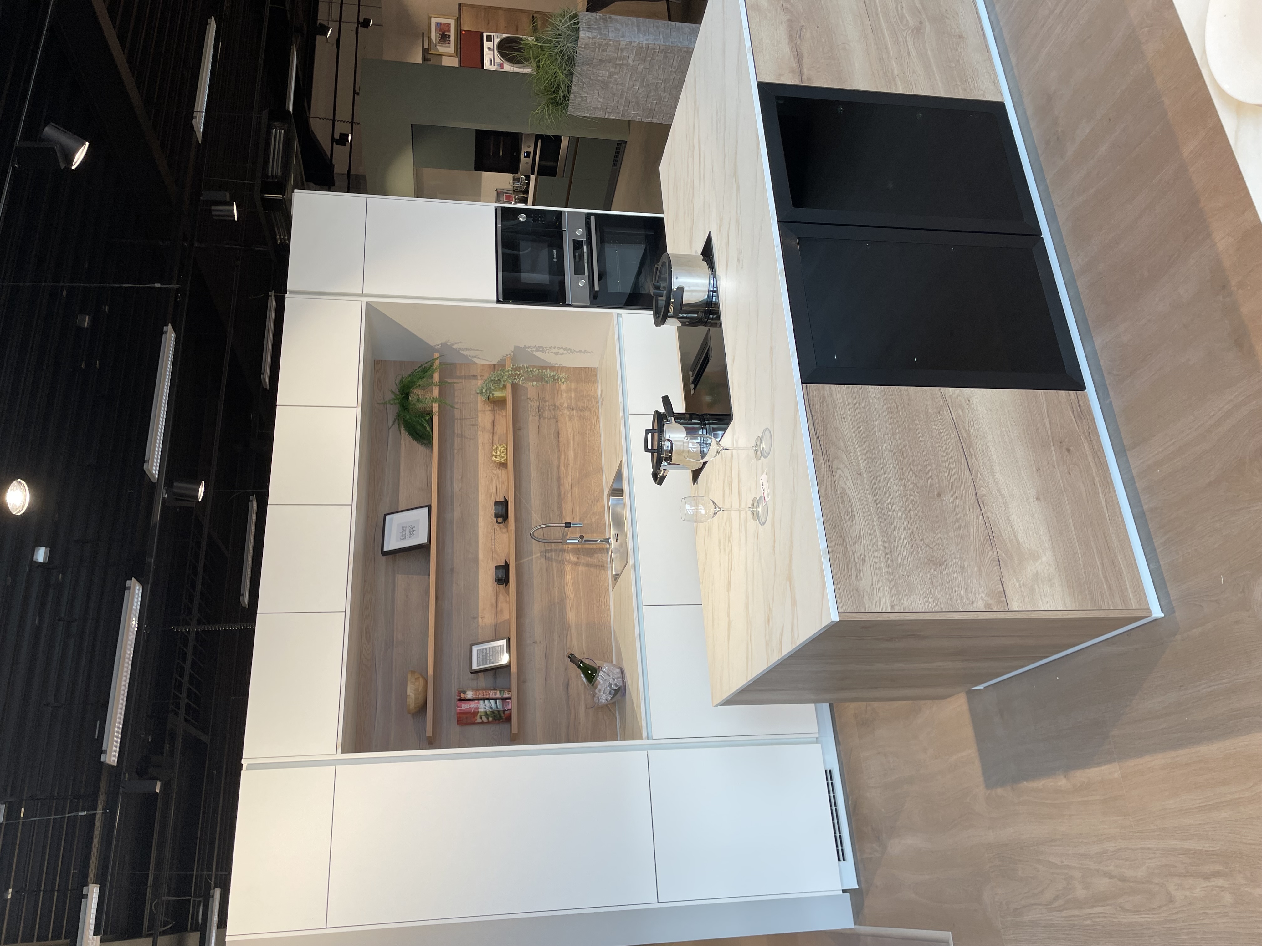 Hoge kasten met opzetkasten, hoge kolom voor koelkast 190cm, kolom voor Oven en magnetron, greeploos, nis vaatwasser, ruime eiland met kookplaat en inbouw dampkap, 2x vitrine xl-onderkasten met verlichting, spoelladekast. wand planken, achterwand in decor. Mechanische openingsondersteuning bi de lad...